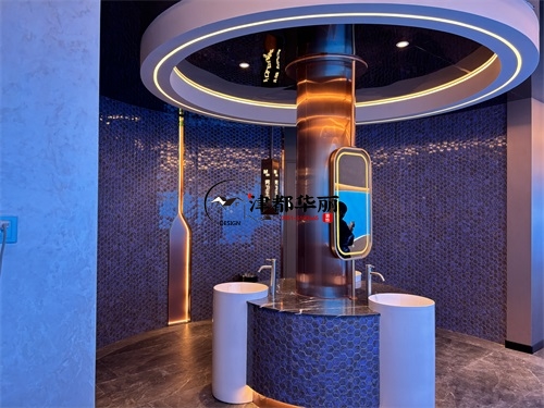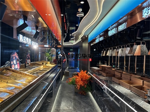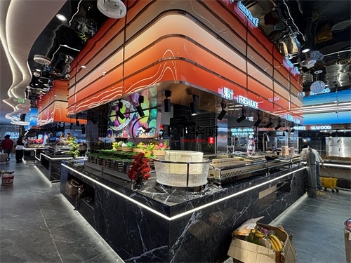 今天分享的是銀川回香漁自助餐廳裝修設計實景,這家自助餐廳裝修設計將“潮流科技感”與“輕奢休閑風”兩種風格巧妙融合在一起,既貼合當下年輕消費群體的審美偏好,又通過空間層次的營造兼顧了自助餐飲的功能需求,是近年餐飲空間設計的典型流行范式。前廳的頂面與墻面采用波浪形的曲面造型,搭配橙紅、寶藍等高飽和度漸變色彩,疊加內嵌式線性燈帶的勾勒,既打破了傳統餐廳的規整感,又通過科技感的光影營造出“賽博休閑”的氛圍——這種手法既借鑒了網紅餐飲的“打卡屬性”設計,又通過色彩分區(如橙紅對應熱菜區、寶藍對應海鮮區)實現了功能引導,讓顧客能快速識別餐區類型。
