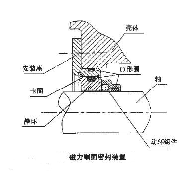 与普通弹簧加载端面密封装置不同,磁力端面密封装置取消了弹簧元件,动环与静环的紧密贴合是靠自身的磁性吸引力达到的。静环是永磁材料,动环是由碳石墨环镶人软磁材料环中构成的。静环(磁材料)与动环(软磁材料)之间依靠磁性吸引力保证石墨环与动环紧密贴合,防止工作流体泄漏。动环与轴之间实现相对移动的密封,并可轴向和角向浮动,自动补偿密封面的磨损。